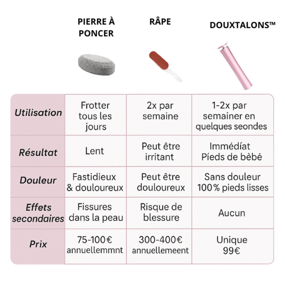 J’ai testé DouxTalons™ hier soir : avant/après impressionnant. Talon rugueux le matin, lisse et rose le soir. Je l’emporte en vacances, fini les râpes métalliques.